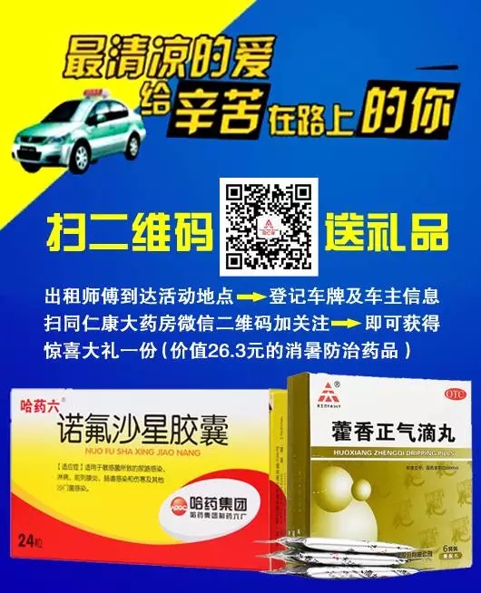 山西同仁康大藥房太原市與孝義市各藥房在7月7日--9日為“的哥、的姐”送上我們***真摯的祝愿,我們?yōu)槟呐谥屏讼顩霾韫┠赓M飲用。并且現(xiàn)場掃碼即可獲贈價值26.3元的消暑防治藥品(天士力集團的藿香正氣滴丸和哈藥集團的諾氟沙星膠囊),同時現(xiàn)場還免費贈送您價值5元的優(yōu)惠券四張,持此券您可在山西同仁康各藥房特惠購藥。
